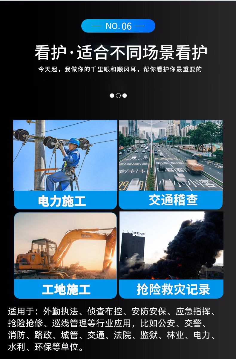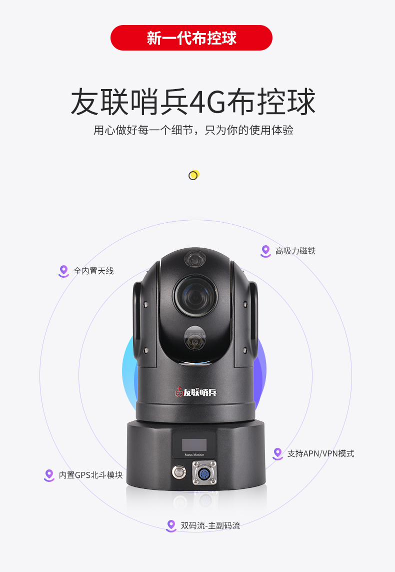 友聯哨兵5G高清智能布控球是一款功能全面、攜帶方便的無線視頻應急指揮一體化產品,超高設備集成度,內置高性能鋰電池組,外接高清顯示控制終端,具備防水防震等特性,可滿足臨時布控和快速安裝的特殊要求。執行任務時可快速將設備臨時安放在需要監控的位置或伸縮式三角架上,亦可直接吸附在車輛上,任務結束時可方便將設備拆下。適用于外勤執法、偵查布控、安防安保、應急指揮、搶險搶修、巡線管理等行業應用,比如公安、交警、消防、路政、城管、交通、法院、監獄、林業、電力、水利、環保等單位。