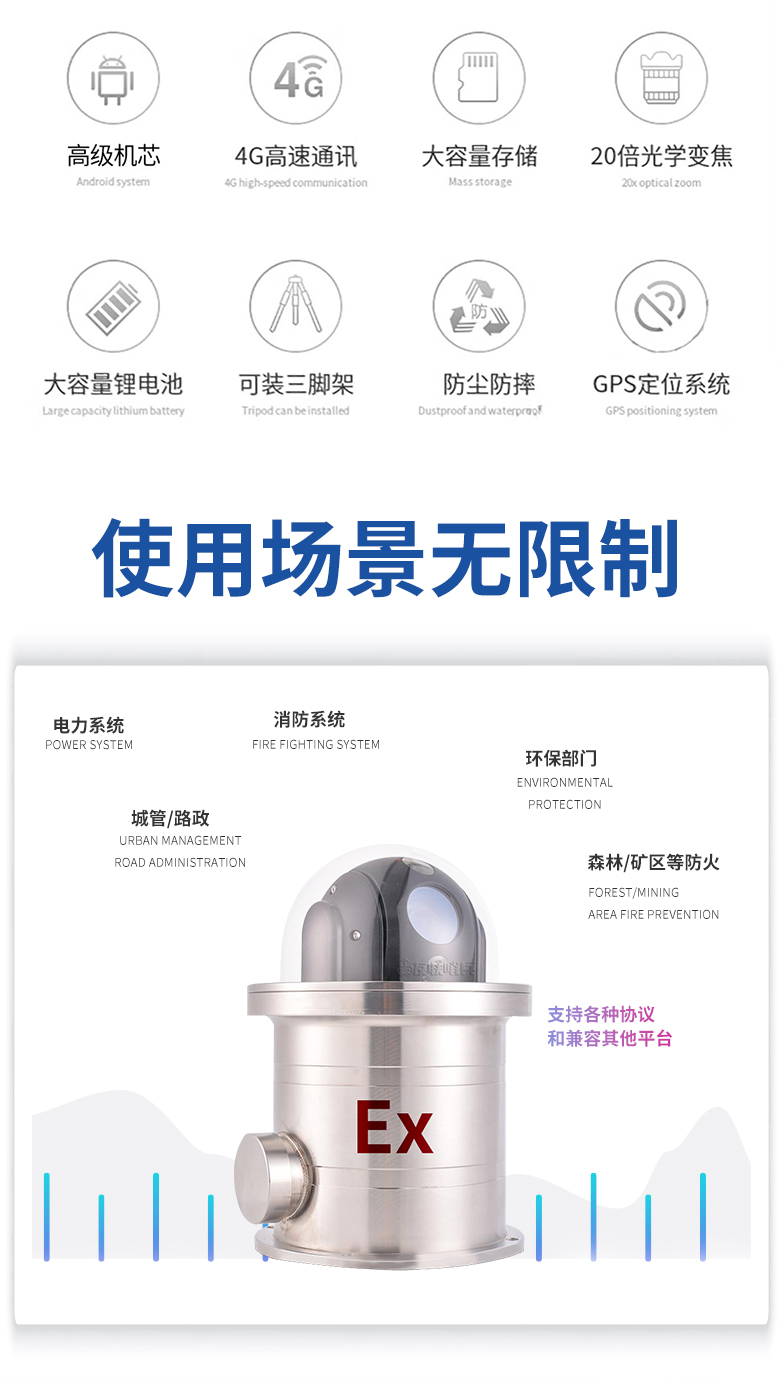 友聯(lián)哨兵無(wú)線高清國(guó)網(wǎng)電力雙4G智能AI布控球 黑光原彩 | 紅外夜視 友聯(lián)哨兵移動(dòng)監(jiān)控布控球,主要用于視頻監(jiān)控、取證,采用蓄電池為主供電的模式,無(wú)線網(wǎng)絡(luò)傳輸,啟用流程簡(jiǎn)單,擺脫繁瑣的選址操作 ;用戶提供高清、流暢、穩(wěn)定的視頻效果,可實(shí)現(xiàn)存儲(chǔ)、傳輸、定位、對(duì)講等功能,并支持人臉車牌識(shí)別、安全生產(chǎn)行為分析、目標(biāo)檢測(cè)AI智能視頻算法,實(shí)現(xiàn)多智能化管控。整機(jī)投入使用,無(wú)需拆裝,縮短工期;一次性費(fèi)用投入,多場(chǎng)景反復(fù)使用,獲得更大投入產(chǎn)出比;根據(jù)項(xiàng)目進(jìn)度更改部署位置,使用更靈活;易于擴(kuò)展新功能,兼容性更強(qiáng)。