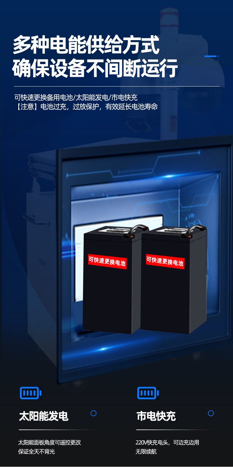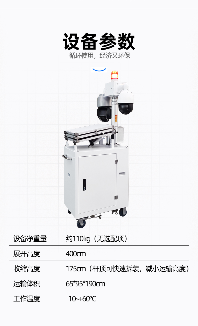 小哨兵移動監(jiān)控系統(tǒng)太陽能電池供電超長續(xù)航便捷監(jiān)控 友聯(lián)哨兵多功能移動兵站(輕便型小哨兵移動監(jiān)控)是一款十分靈活的中小型移動監(jiān)控設(shè)備,自帶網(wǎng)電,具備較高的機(jī)動性,系統(tǒng)可集高清視頻監(jiān)控、照明、報警、廣播、對講、氣象環(huán)境監(jiān)測、存儲、控制、無線傳輸、一鍵升降等功能于一體,并可具備市電、太陽能等多種能源補給方式,提升續(xù)航時間,以適應(yīng)各類復(fù)雜的環(huán)境。戶外使用,不懼風(fēng)雨,隨需移動,循環(huán)利用。可廣泛用于石油管道巡檢、工地監(jiān)控、電力維修監(jiān)控、活動安防、戶外作業(yè)等臨時監(jiān)控或長期監(jiān)控。